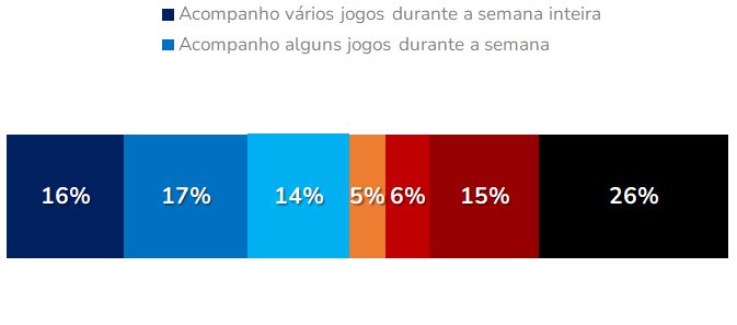 As maioresregularidades no hábitosemanal são entre homens (64%), brasileiros entre 16 e 24 anos (56%), os que recebem mais de cinco salários mínimos (53%), moradores do Sudeste (51%) e do Norte/Centro-Oeste (51%) e pessoas autodeclaradas pretas 52%. Por sua vez, o grupo que não assiste a partidas de futebol é composto por: maioria de mulheres (36%), moradores do Nordeste (34%), pessoas acima de 60 anos (30%) e de 41 a 59 anos são 29%, brancos (29%) e Analfabetos/Sabe ler e escrever são 41%