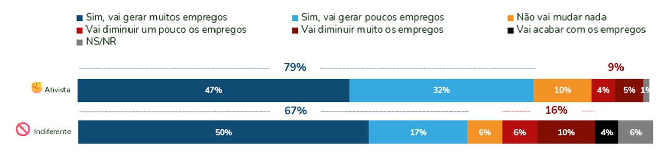 Entre os chamados “ativistas”, brasileiros que mais adotam práticas sustentáveis na rotina, são 79% os que acreditam na geração de novos empregos com a transição para uma economia mais sustentável. Desses, 47% acham que vai gerar muitos empregos e 32%, poucos novos empregos. Já entre a parcela da população que não adota nenhum tipo de prática sustentável no cotidiano, esse número cai para 67%, com 50% apostando em muitos empregos e 17%, poucos novos postos de trabalho.