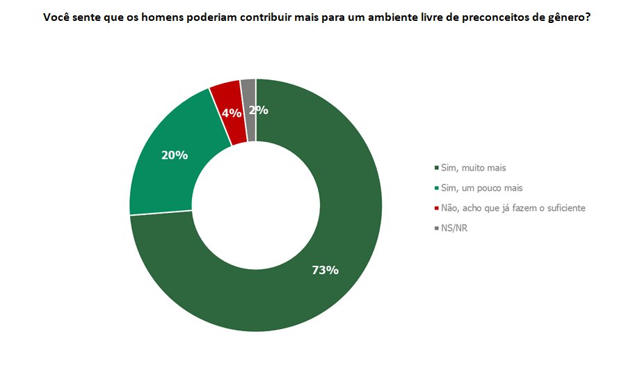 Apesar disso, menos da metade (45%) das entrevistadas pensa que os homens contribuem, que seja muito (14%) ou um pouco (31%), para um ambiente de trabalho sem preconceitos.