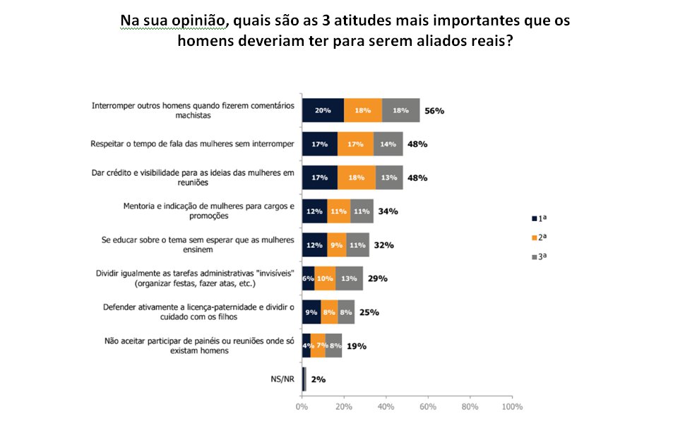 Depois vieram mentorar e indicar mulheres para cargos e promoções (34%), se educar sobre o tema do preconceito de gênero (32%), dividir igualmente tarefas administrativas “invisíveis” como organizar eventos (29%), defender ativamente a licença-paternidade (25%) e não aceitar participar de reuniões com presença exclusiva de homens (19%). As entrevistadas poderiam elencar as 3 principais respostas.