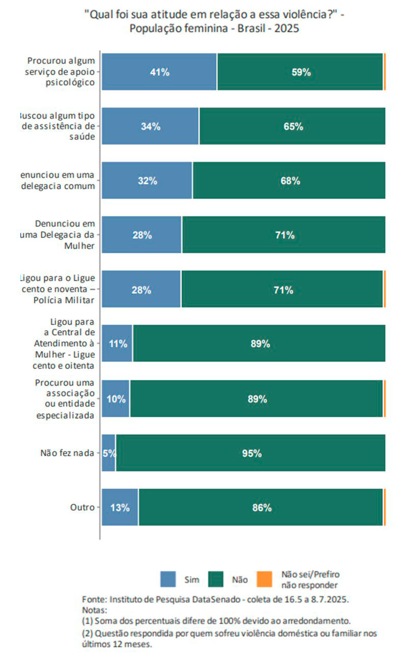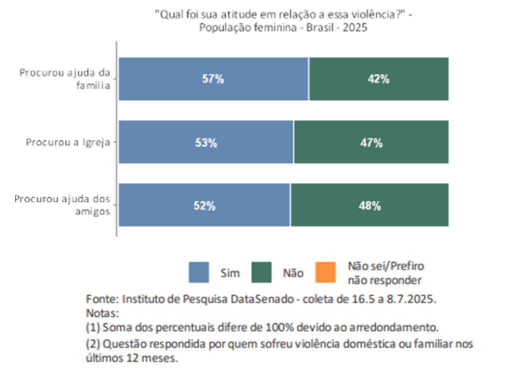 A pesquisa do DataSenado e da Nexus também registra que a procura por serviços formais é menor do que a busca por redes informais. Enquanto 57% das brasileiras agredidas nos últimos 12 meses buscaram a família, 53%, a igreja e 52%, os amigos, as Delegacias Especializadas de Atendimento à Mulher (DEAMs) foram procuradas por 28% das vítimas, e o número 180, serviço de orientação e denúncia, por 11% das mulheres. Por outro lado, apenas 5% das brasileiras agredidas no último ano não tomaram nenhuma atitude após o episódio de violência, revelando a disposição das vítimas em buscar ajuda e romper o silêncio.