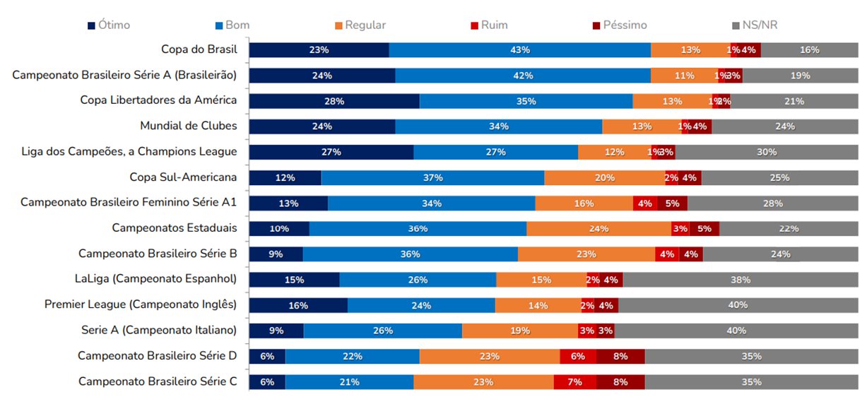 Entre os diversos torneios no mundo, o Campeonato Brasileiro e a Copa do Brasil despontam como – as competições de maior prestígio, ambos com 66% de avaliação “ótima” ou “boa”. Levantamento revela que estaduais têm mais adeptos do que ligas europeias