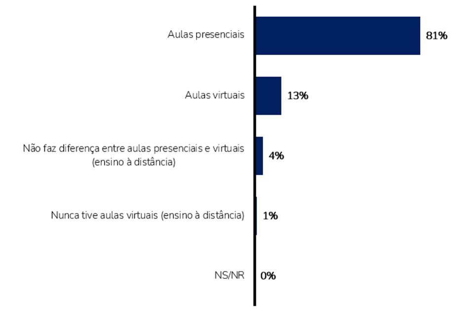 A preferência pelo aprendizado presencial é massiva, com oito em cada dez jovens (81%) afirmando ter um rendimento melhor nesse modelo. Apenas 13% consideram que aprendem mais e melhor no formato online ou à distância, indicando que a troca em sala de aula e o contato direto com professores e colegas continuam sendo vistos como fundamentais para sua formação. Por sua vez, 4% afirmam que não há diferença entre os modelos de ensino presencial e à distância (EAD) para o aprendizado, enquanto 2% souberam ou não responderam.