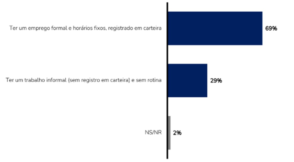 No que tange ao mercado de trabalho, a busca por estabilidade se sobressai. A pesquisa da Demà e da Nexus mostra que quase sete em cada dez jovens (69%) almejam um emprego com carteira assinada, um símbolo de segurança e direitos trabalhistas. Em contrapartida, ter um trabalho informal (sem registro em carteira) e sem rotina é a preferência de 29% dos entrevistados. Outros 2% não souberam ou não responderam.