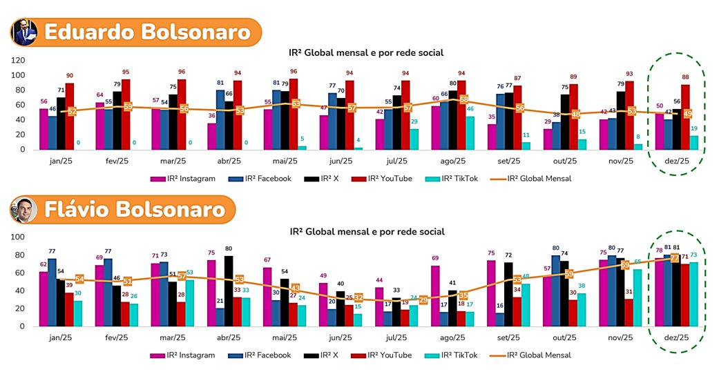 Para se ter uma ideia do crescimento de Flávio após lançar seu nome para presidente, em dezembro de 2025, último mês de coleta dos dados, a média do IR² Nexus de todas as redes sociais do hoje senador foi, pela primeira vez, maior do que a do presidente Lula, que liderou durante os 11 primeiros meses do ano e, por isso, no acumulado total de 2025 se manteve à frente, com um IR² Nexus global 38,5% superior ao de Flávio Bolsonaro.