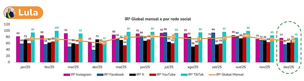 O presidente Lula (PT) apresentou o maior Índice de Relevância das Redes (IR² Nexus) ao longo de todo o ano de 2025. A análise da presença digital foi feita pela Nexus – Pesquisa e Inteligência de Dados, a partir da análise em metodologia proprietária dos 11 principais nomes cotados para a corrida eleitoral de outubro deste ano. Foram levadas em consideração as cinco principais redes sociais — Instagram, X, Facebook, YouTube e TikTok — entre os dias 1º de janeiro e 31 de dezembro de 2025. Os dados não incluem o ex-presidente Jair Bolsonaro, que está preso, proibido de utilizar redes sociais e inelegível por determinação do Tribunal Superior Eleitoral (TSE).