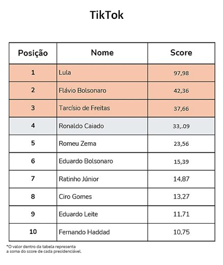 De todas as redes sociais, o TikTok é a plataforma em que Lula obteve maior nota (97,98) no IR² Nexus, mais que o dobro do segundo colocado, Flávio Bolsonaro (42,36). Lula é destaque em quase todas as métricas: maior base de seguidores (5,3 milhões), maior frequência de postagens (643), maior volume de curtidas e de comentários, o que resulta em mais de 11,5 milhões de interações totais. Flávio Bolsonaro consolida-se na segunda posição, com um score de 42,36, destacando-se como a principal referência em eficiência na rede, além de garantir visibilidade com mais de 5,6 milhões de interações.