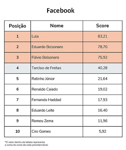 Completando a tríade de plataformas lideradas por Lula, no Facebook o atual presidente aparece com IR² Nexus de 83,21 pontos, um pouco acima do segundo colocado, Eduardo Bolsonaro (78,70). A liderança é sustentada pela maior base de seguidores (6,03 milhões) e um desempenho consistente em interações. Já o ex-deputado se destaca pela eficiência e maior volume de comentários, o que mantém sua presença forte mesmo com uma base de seguidores menor que a do atual presidente.