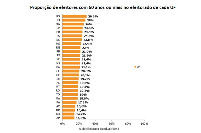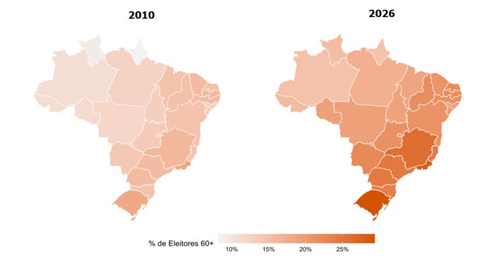 Entre 2010 e 2026, os maiores avanços reais na proporção dos 60+ aptos a votar ocorreram no Rio Grande do Sul (+11,2 p.p.), no Espírito Santo (+10,2 p.p.) e em Minas Gerais (+9,8 p.p.). Rio de Janeiro (+9,5 p.p.), São Paulo (+9,1 p.p.)  e Santa Catarina (+9,1 p.p) aparecem na sequência, indicando que a porcentagem aumenta em alguns dos maiores colégios eleitorais do país.
