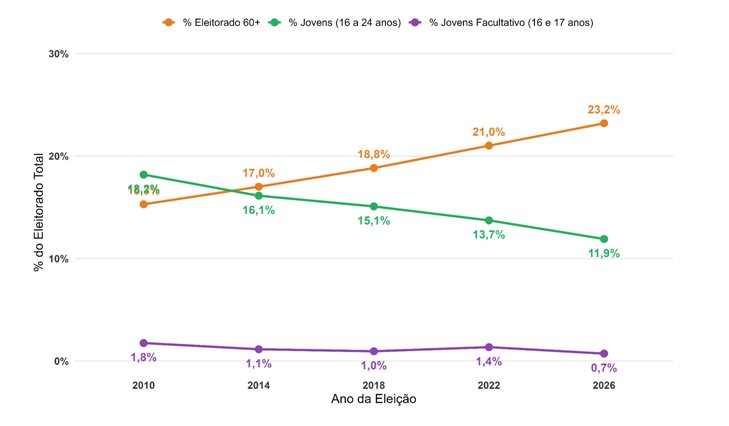 Enquanto o número de eleitores de todas as faixas etárias aumentou 15% entre 2010 e 2026, o eleitorado 60+ cresceu 74% no mesmo período