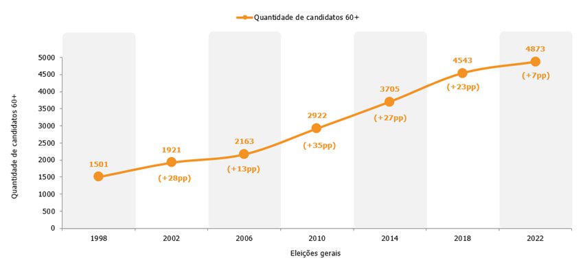 O número de candidatos com 60 anos ou mais também têm aumentado anualmente no Brasil, tanto nas eleições gerais quanto nas municipais. Segundo dados do TSE, nas últimas eleições, em 2024, mais de 70 mil brasileiros com 60+ se candidataram aos cargos em disputa, o que equivale a 15% de todas as candidaturas. O montante é o maior desde o início da série histórica, iniciada em 1998. O pleito anterior, em 2022, também registrou o recorde para eleições gerais: 4.873 candidatos com 60 anos ou mais, o que equivale a 17% das candidaturas.