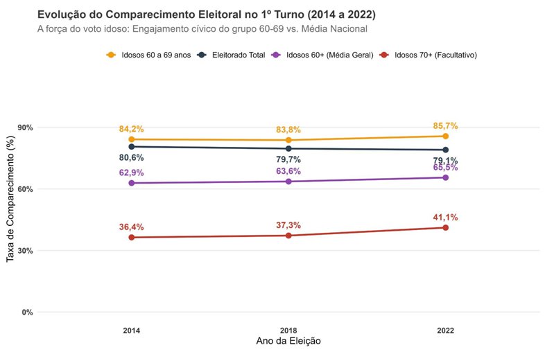 Dos 32,9 milhões de pessoas da Geração 60+ que poderiam votar nas últimas eleições federais, 21,6 milhões estiveram presentes no primeiro turno, uma taxa de comparecimento de 65,5%. Se levarmos em consideração apenas os brasileiros de 60 a 69 anos, cujo voto ainda é obrigatório, esse percentual sobe para 85,7%.